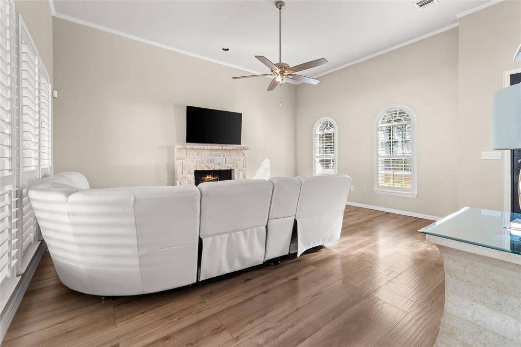 The open living room showcases soaring ceilings, abundant natural light, and a stone fireplace, creating an inviting gathering space for family and guests. Plantation shutters are installed throughout the home, providing both style and added privacy.
