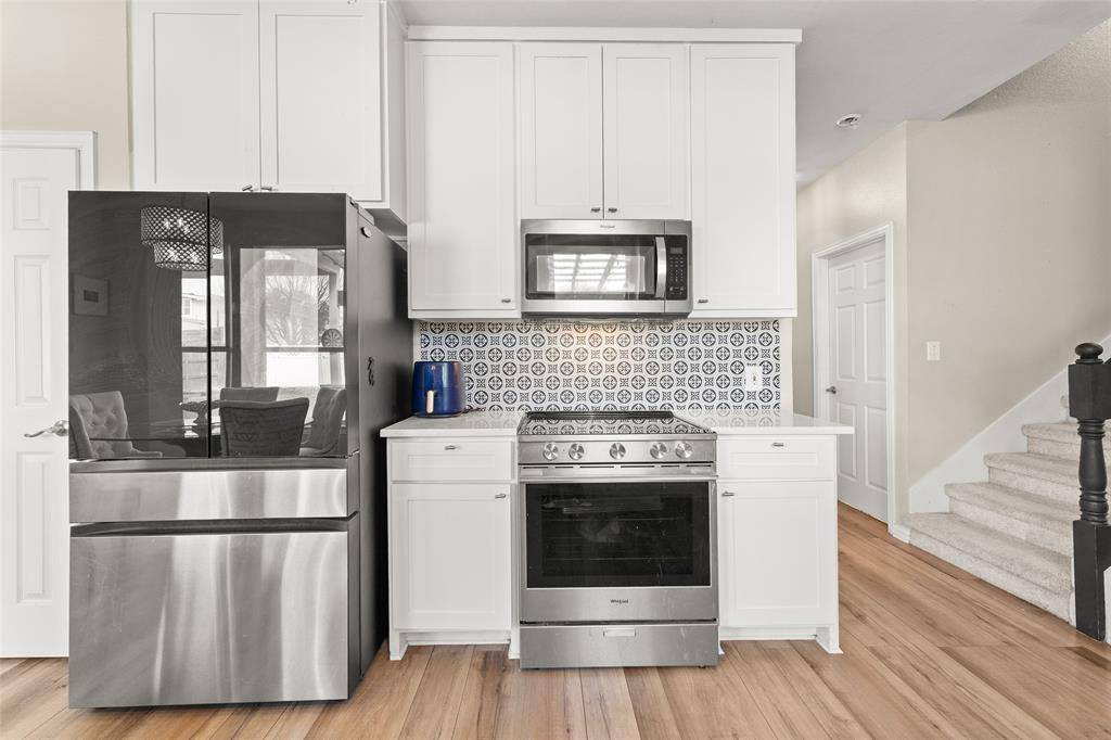 The kitchen includes quartz countertops, stainless appliances, extensive cabinetry, and a decorative tile backsplash, with casual dining nestled into bay windows overlooking the backyard. Quartz surfaces continue into the bathrooms, offering a cohesive modern finish.