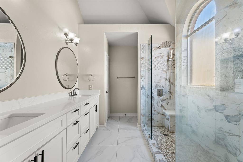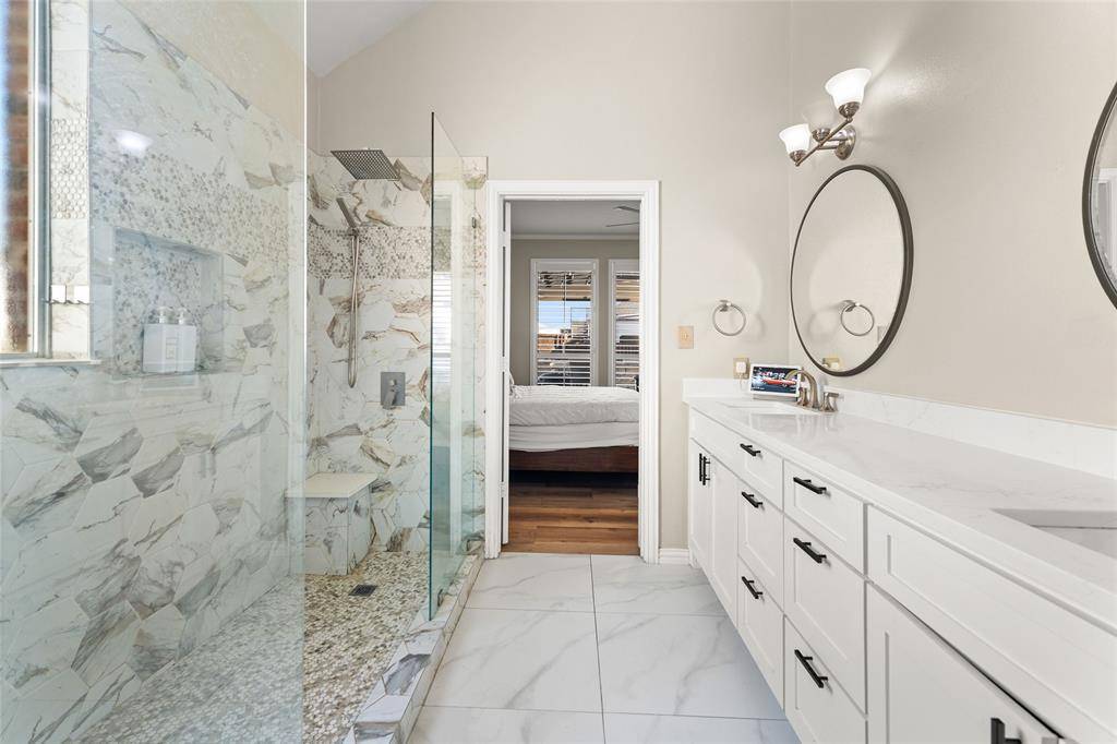 The spacious primary suite serves as a relaxing owner's retreat, featuring a long double vanity and a spa-inspired bathroom with a large walk-in shower designed for two, complete with dual shower heads, a rain shower feature, and built-in bench seating.