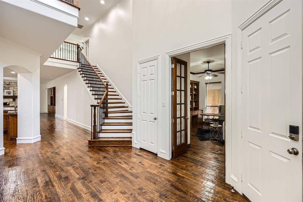 This stunning four-bedroom, three-and-a-half-bath residence blends timeless architecture with refined updates. From the moment you enter, soaring two-story ceilings and a sweeping staircase create a grand yet welcoming first impression.